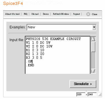 Type the SPICE input file into the input window and click on the 'Simulate' button: